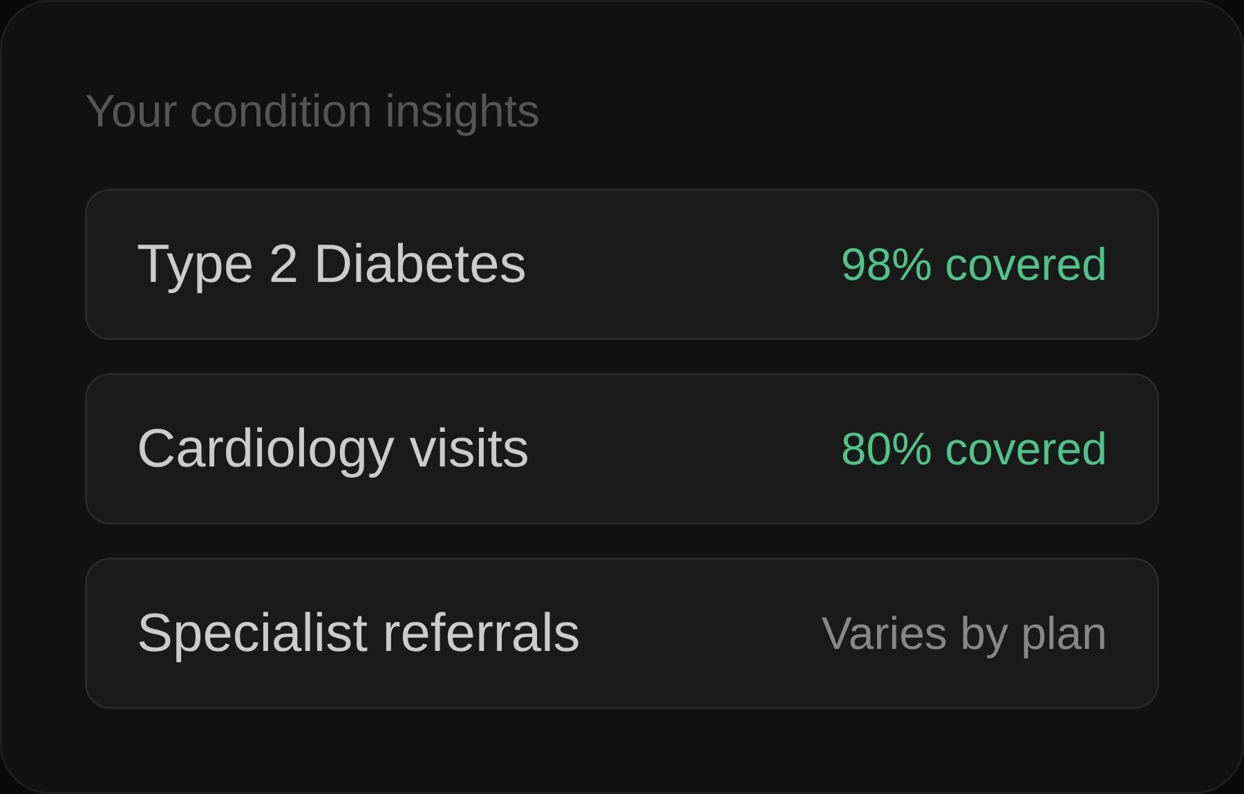 Get analytics on your diagnoses and conditions so you always know what's covered and what to expect.