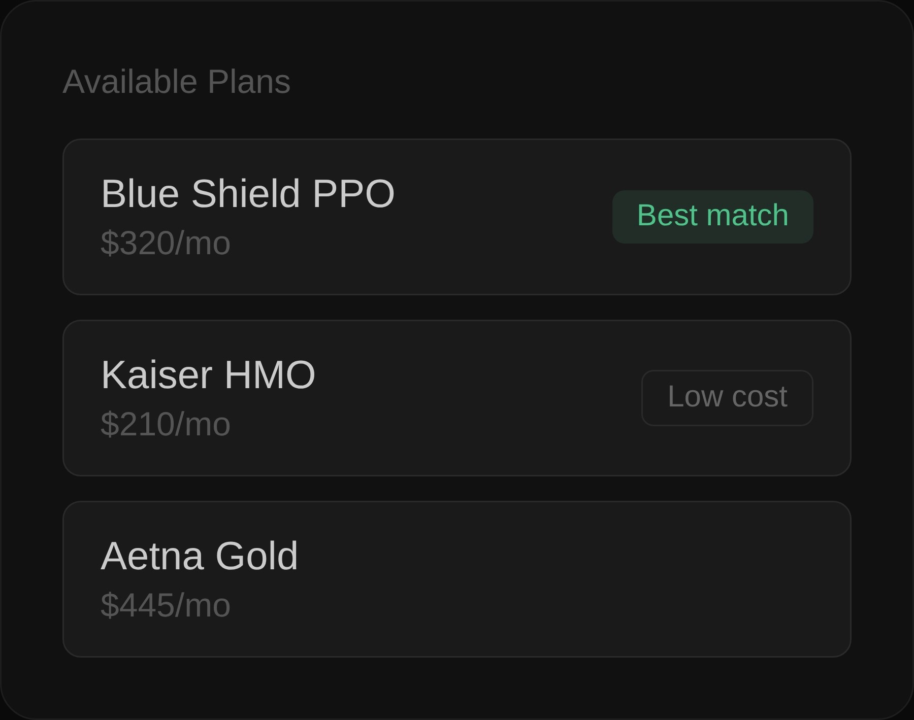 We surface the best insurance plans for your needs, ranked by coverage and cost.